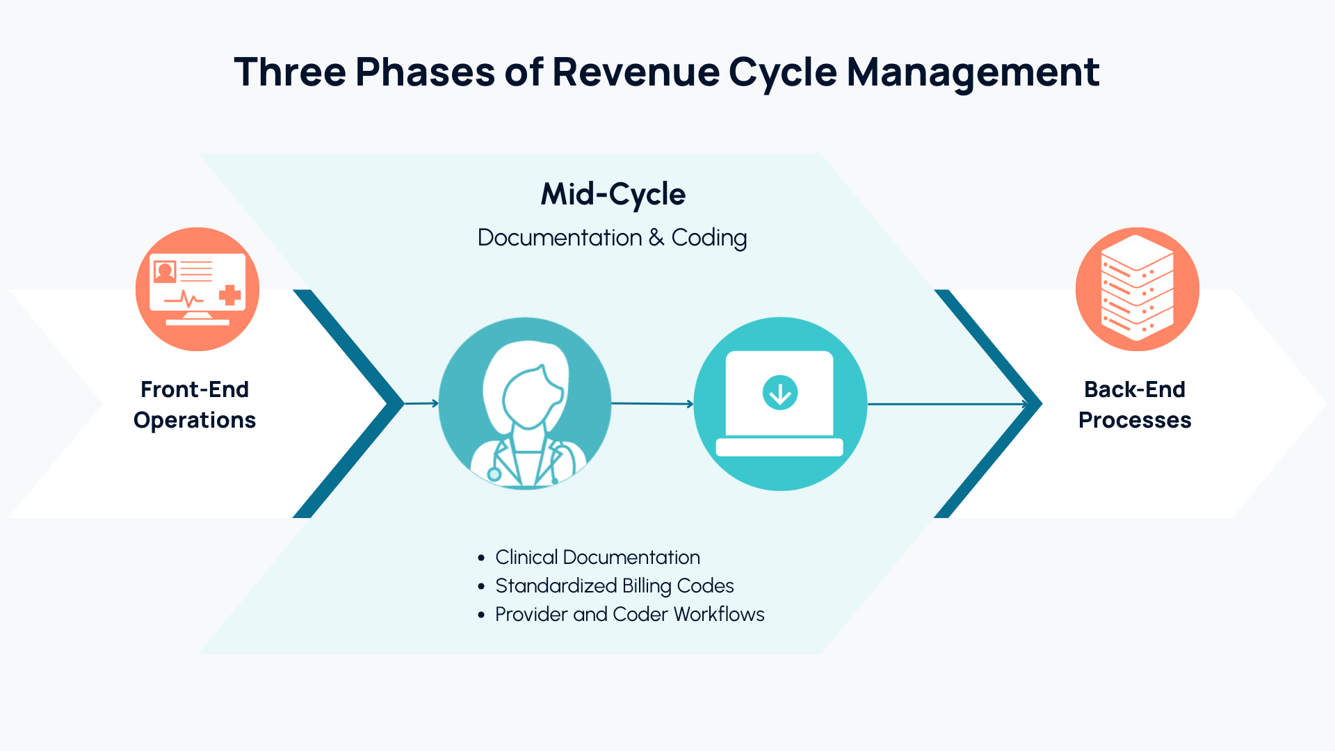 Back-end processes involve claim submission, audits, payment posting, denial management, and collections.